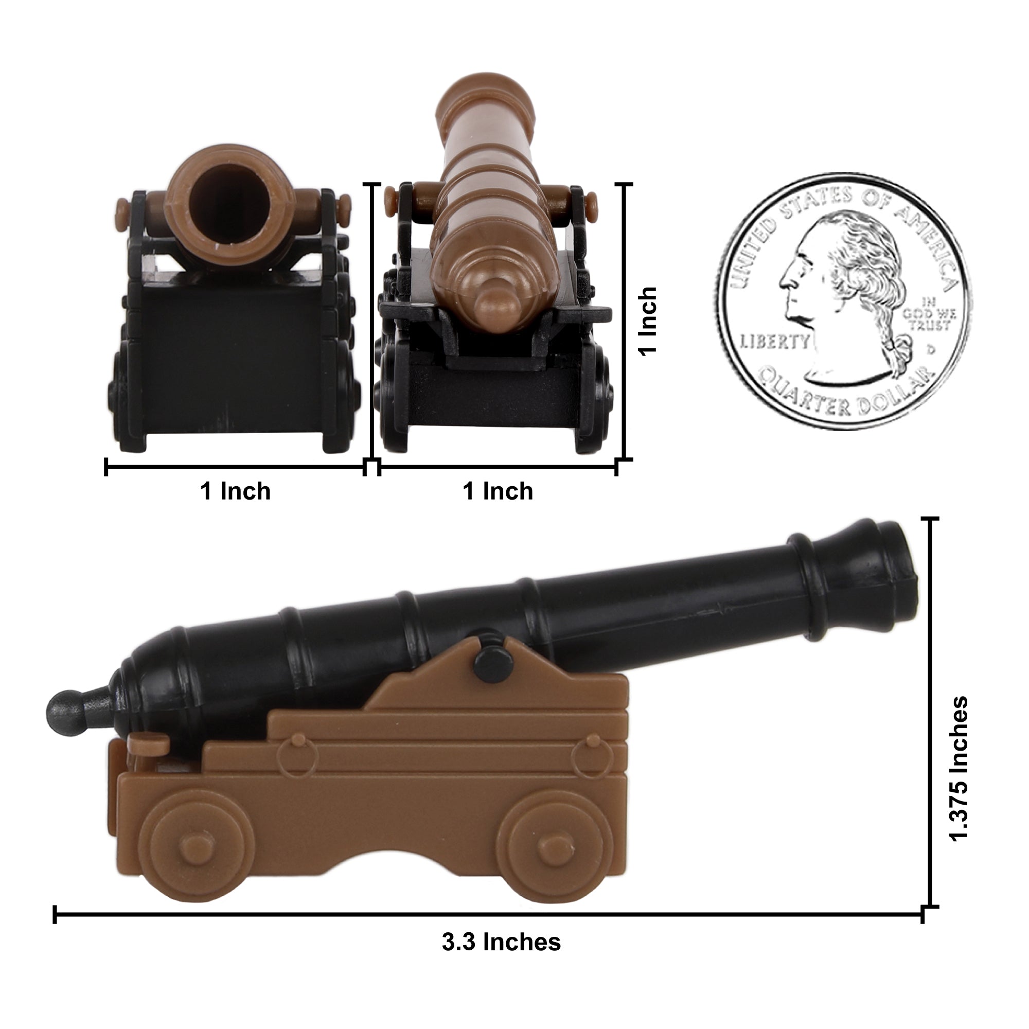 From the BMC Toys Classic Toy Soldier Collector Series, the Naval Cannon 6 piece Set includes Armstrong-Fredrick Style Artillery in 2 colors with elevating barrel. Barrels and chassis are reversible black and bronze that can be easily swapped to make all black or all bronze. Each cannon measures 1 inch x 1 inch x 3 inches long. Made from stiff ABS plastic and approximately 1:40 scale as a 32lb cannon, 1:32 scale as a 12lb cannon, and 1:18 scale as a 3lb cannon. These cannon were initially offered to hobby collectors by Classic Toy Soldiers Company around 1996. Classic Toy Soldiers Co. worked with BMC Toys to make them available to today's youngsters. BMC Toys was founded by Bill McMaster in 1991 and specializes in producing historically accurate Plastic Army Men figures and Playsets in the classic realistic classic realistic miniature style of the 1950s and 1960s. These accessories are a perfect addition for Playsets and school project dioramas of many eras and conflicts from the 17th to early 20th century including the American Revolutionary War, War of 1812, Napoleonic era Conflicts, Pirates, Battle of The Alamo, and Civil War. Packaged in clear bag with header card and recommended for ages 5 and up.
