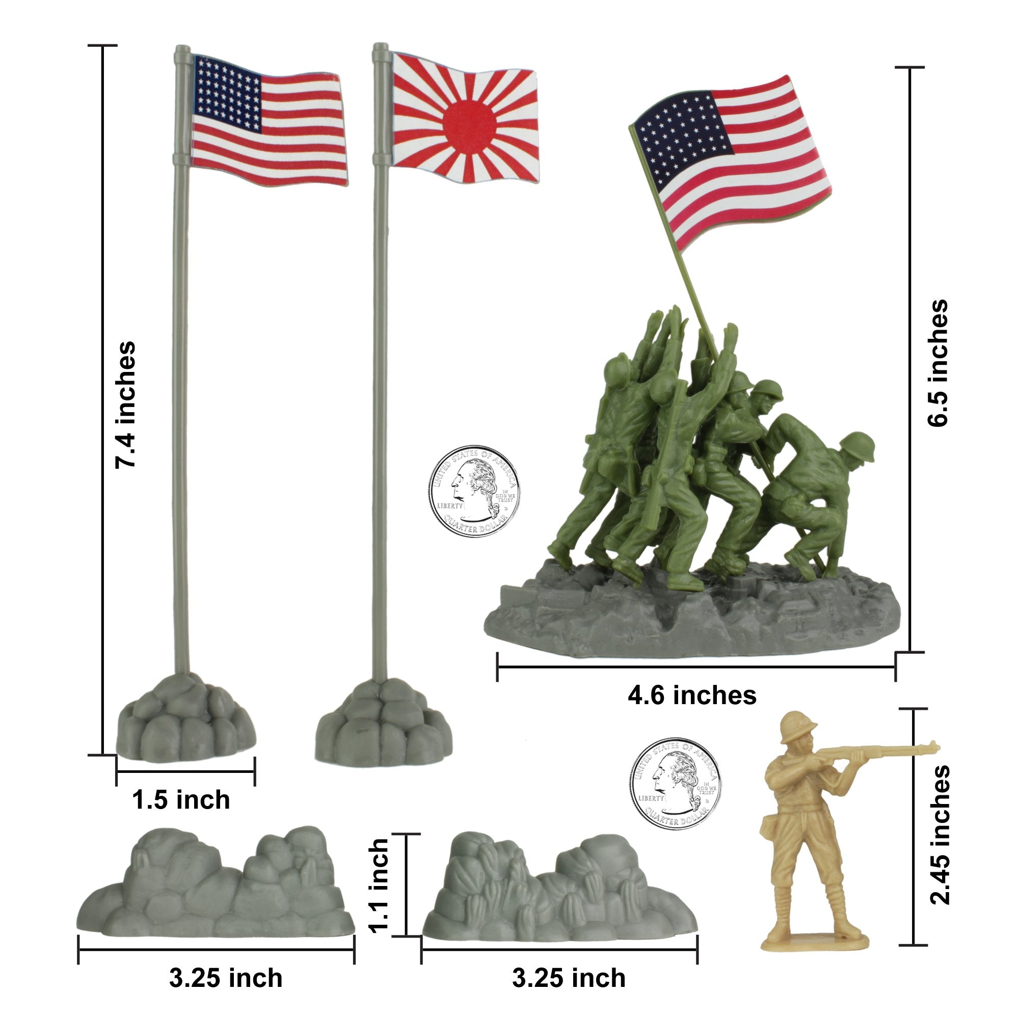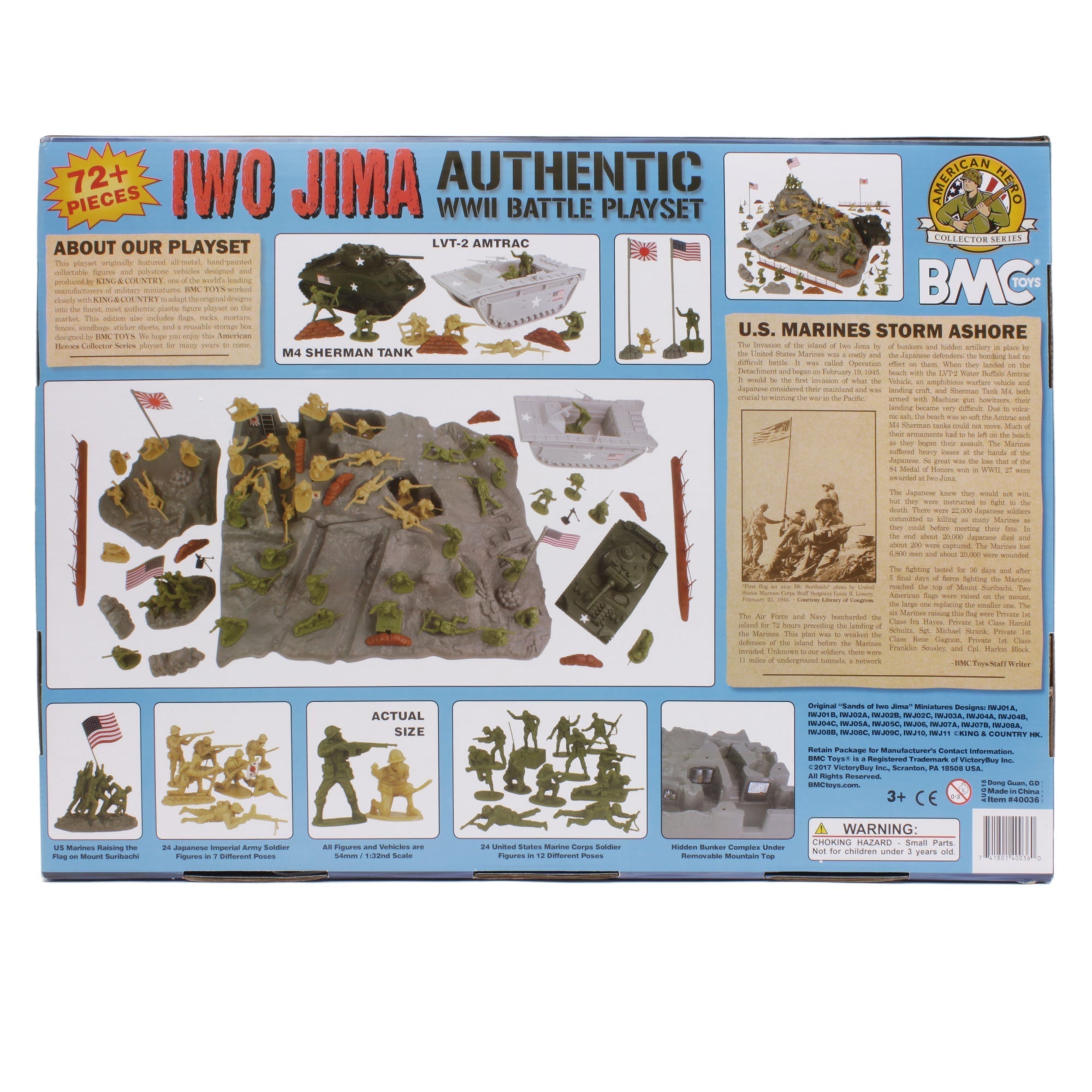 From the BMC Toys American Hero Collector Series, a fierce conflict that included the most iconic moment from the Pacific War theater: The Battle of Iwo Jima 72 piece Plastic Army Men Playset contains 24 United Stated Marines in OD-Green, 24 Japanese Soldiers in tan, and features 6 Marines raising the American flag. The Set also includes a Dark-Green M4 Sherman Tank with a turret that rotates, gray LVT-2 Amtrac Amphibious Vehicle with 3 MGs, 2 flags with bases, 2 small rock formations, 8 sandbag stacks, 2 Barbed Wire Fences, 2 mortars, and a Large Mount Suribachi. The Mountain features beach landing areas and a removable top that conceals a warren of hidden enemy bunkers. All pieces are about 1:32nd scale and made from durable polypropylene or polythene plastic with lots of authentic detail and almost no flashing. Figures stand up to 2.45 inches tall. The Sherman Tank measures 7.5 x 3.5 x 3.75 inches tall, and the Amtrak measures 9.2 x 3.9 x 3.5 inches tall. The Mountain measures 19 x 15.5 x 5.5 inches high. This Playset was adapted from the original Sands of Iwo Jima fine metal and polystone miniature designs and is officially licensed by King & Country. BMC Toys was founded by Bill McMaster in 1991 and specializes in producing historically accurate Plastic Army Men figures, Playsets and accessories in the classic realistic style of the 1950s and 1960s. This release features an American flag, Japanese flag, small rock formations mortars, sandbag stacks fences and sticker sheets. Packaged in an a tray style storage box that features the history of the Battle of Iwo Jima. Recommended for ages 5 and up.