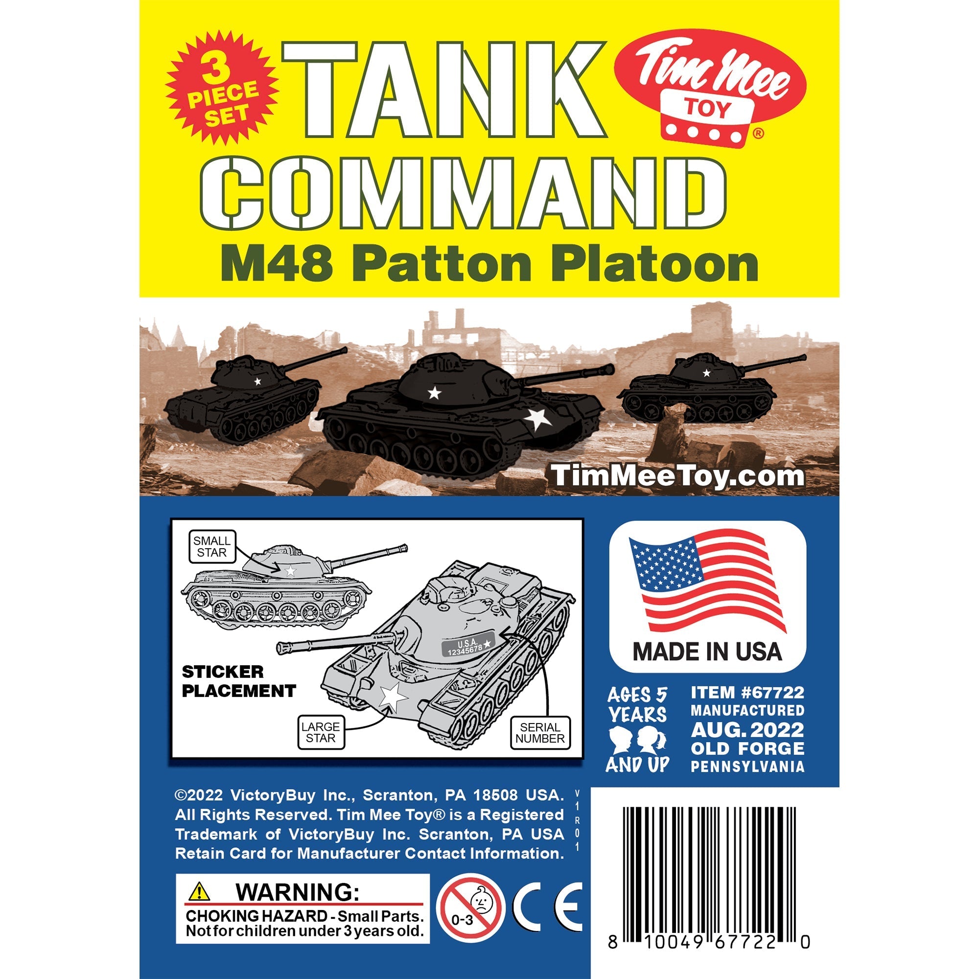 Modeled after the M48A2 Patton Tank, Tim Mee Toy first produced this toy in 1964 and modified the tooling several times over the decades until the final version seen here. Pack includes optional sticker sheet with the classic stars and serial numbers and bonus mini-stars and Tim Mee Toy logo.