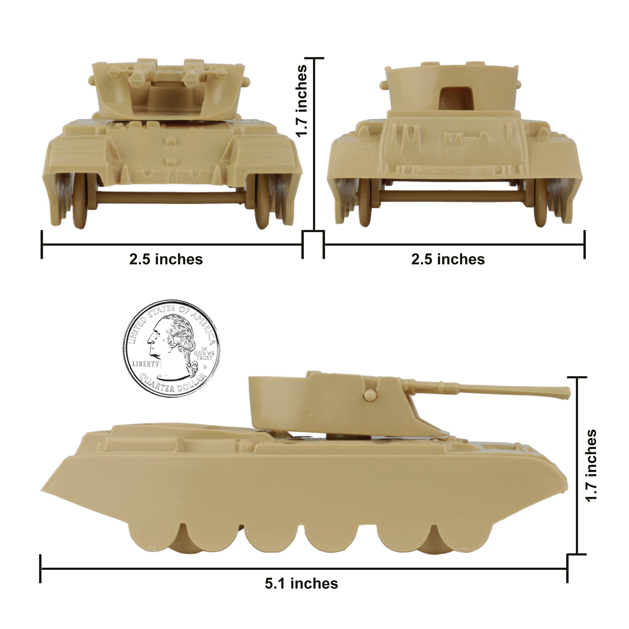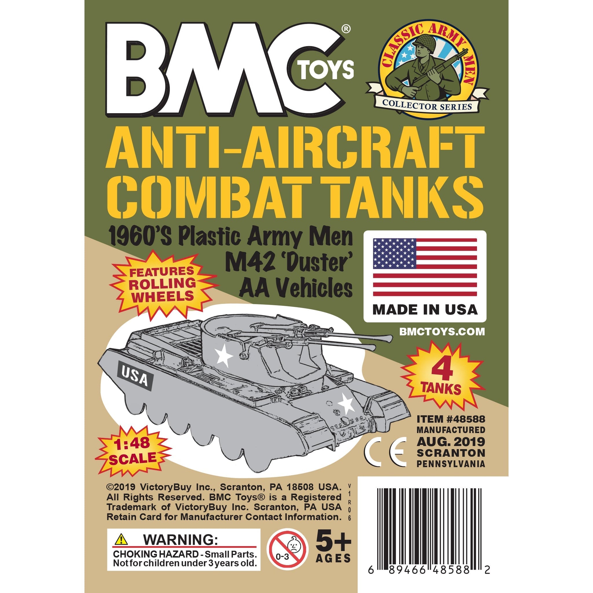 From the Classic Army Men Collector Series, BMC Toys brings back another American toy from yesteryear. This pack of 4 'Duster' Anti-Aircraft Tanks is proudly manufactured in the United States. The Set includes 2 tan and 2 olive-drab green vehicles and features barrells that pivot, turrets that rotate, and rolling wheels. Tanks are approximately 1:48 scale and are made from slightly flexible HDPE plastic with medium detail and very little flashing. These Tanks were originally produced in the 1960s by PAYTON and were included in numerous plastic military Playsets from several companies over the years. They were even copied and produced overseas in the 1980s. Even in the 21st century they're still great reinforcements for your Plastic Army Men forces, and also just the right size for O-gauge train flatbed cars. This is a Set of real American Made plastic toys, meant to be rolled around, knocked over, picked up and played with for many years to come. Packed in clear bag bag with insert card and recommended for ages 5 and up.