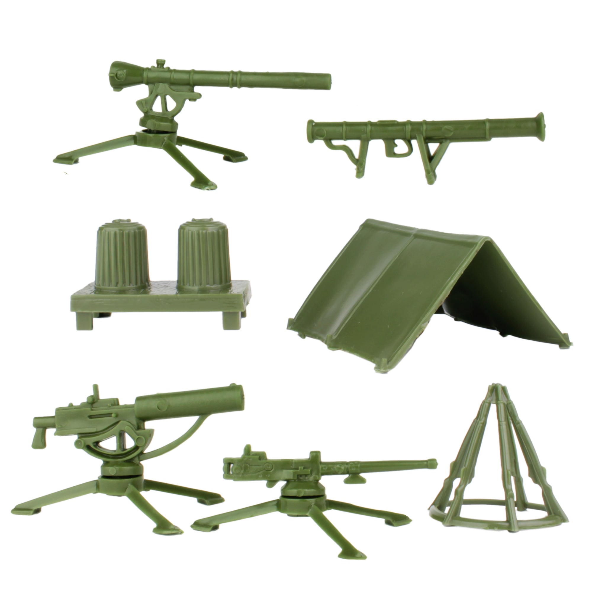 BMC Toys Bucket of Plastic Army Women 100 piece Set. Tan and OD-Green teams each include 34 Plastic Army Women figures, Military Working Dog, stretcher, anti-aircraft Tank, landing craft, and 10 accessories The female Soldiers are classic combat poses and styled after the best 'Little Green Army men' from the 20th Century in 22 different poses. Poses including Pathfinder Captain, Standing Rifleman, Kneeling Rifleman, Prone Rifleman, Prone Sharpshooter, Grenadier, Bazooka Operator, Running Riflemen, Advancing with Bayonet, Combat Medic, Low Crawling, Radio Operator, Wounded Soldier, Light MGner, Nurse, Corpsman, Military Working Dog, MWD Handler, and stretcher accessory. Troops stand up to 2.1 inches tall and approximately 1:32 scale. Made from slightly flexible LDPE Plastic. The accessories include 3 Pup Tents, 2 Rifle Stacks rifle stacks with five M1 Garands each, Trash Cans on Platform, M9A1 Bazooka, and tripod mounted M2 Browning50 Caliber Air-cooled MG, M1917 Browning Water-cooled MG, and M18 Recoilless Rifle. Scales of the vehicles and accessories vary from 1:72 to 1:24. This is a Set of real American Made toys, meant to be set up, knocked down, picked up and played with for years to come. Packed in sturdy reusable storage bucket and recommended for ages 5 and up.