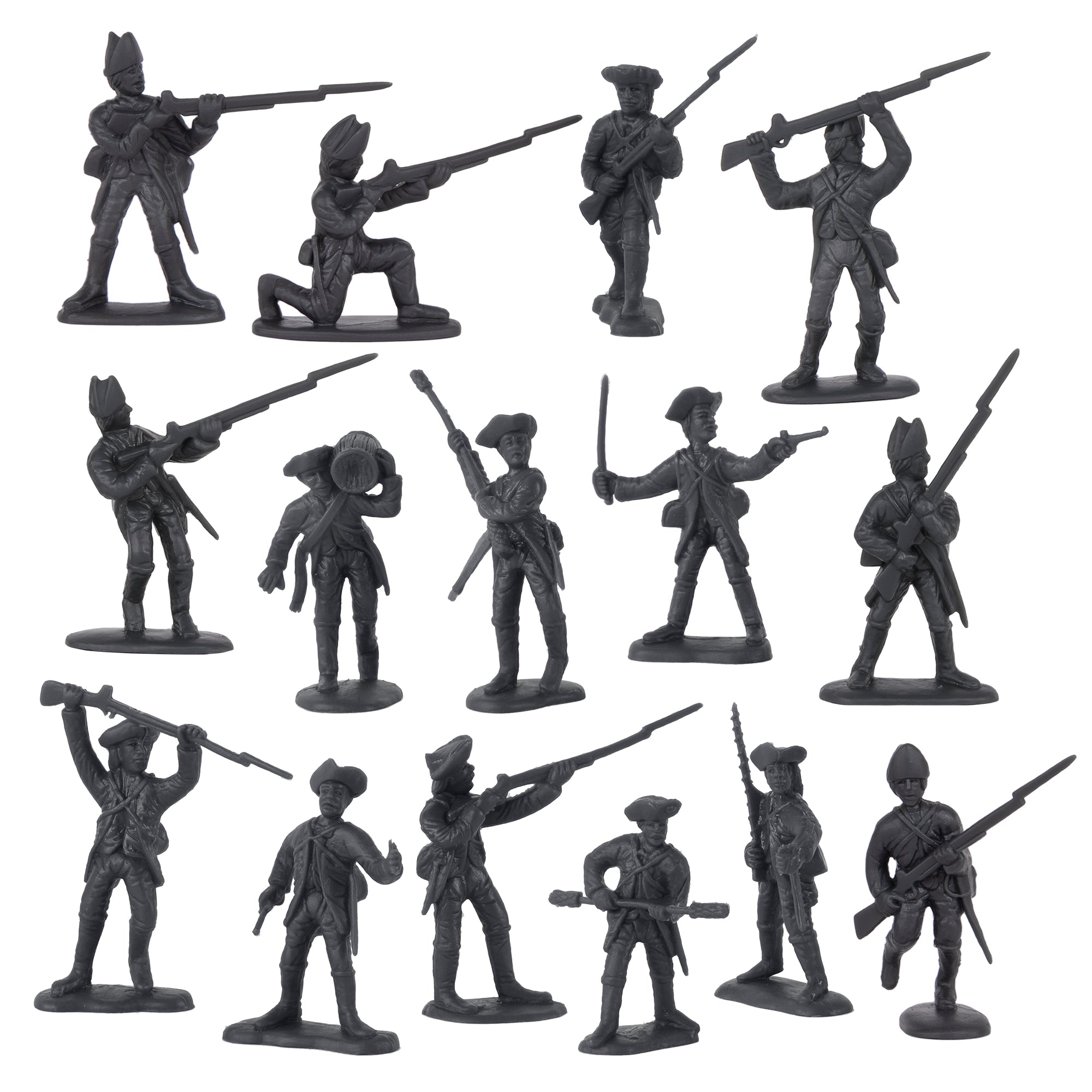 From the BMC Toys American Hero Collector Series a decisive victory for the Americans that changed the course of history. The American Revolutionary War Battle of Yorktown 208 piece Plastic Army Men Playset features 30 different figures and includes 42 blue Colonial Americans, 42 British Empire Redcoats, 23 antique-white French, and 25 coal-black Hessian troops. Also includes character figures of General Charles Cornwallis, General Marquis de Lafayette and General George Washington astride his horse 'Blueskin'. Set includes 8 cannon with rolling wheels 8 mortar, and lots of terrain and camp accessories. Supplies include 3 large crates, 3 small crates, 2 supply stacks, camp supply terrain piece, 3 camp fires, hanging pot, table and 4 stools, 2 wooden wheel carts, and 2 farm horses. Terrain pieces include 4 large redoubt positions, 2 split rail and stone fences, 3 leafy green trees, 2 bare trees, 6 rustic fences, 12 spike barricades, 2 brown rocks, and 2 flags. All pieces are approximately 1:32 scale. Figures stand up to 2.3 inches tall and are made from soft flexible plastic with medium detail and very little flashing. Accessories are made from slightly to very stiff plastic. BMC Toys was founded by Bill McMaster in 1991 and specializes in producing historically accurate Plastic Army Men figures and Playsets in the classic realistic classic realistic miniature style of the 1950s and 1960s. Instructions: With adult supervision, dip any bent part in hot water, then cold water to straighten. These miniature figures are a perfect addition to any American War for Independence Playset or school project diorama. Packaged in a full color box featuring a history of the battle story. Recommended for ages 5 and up