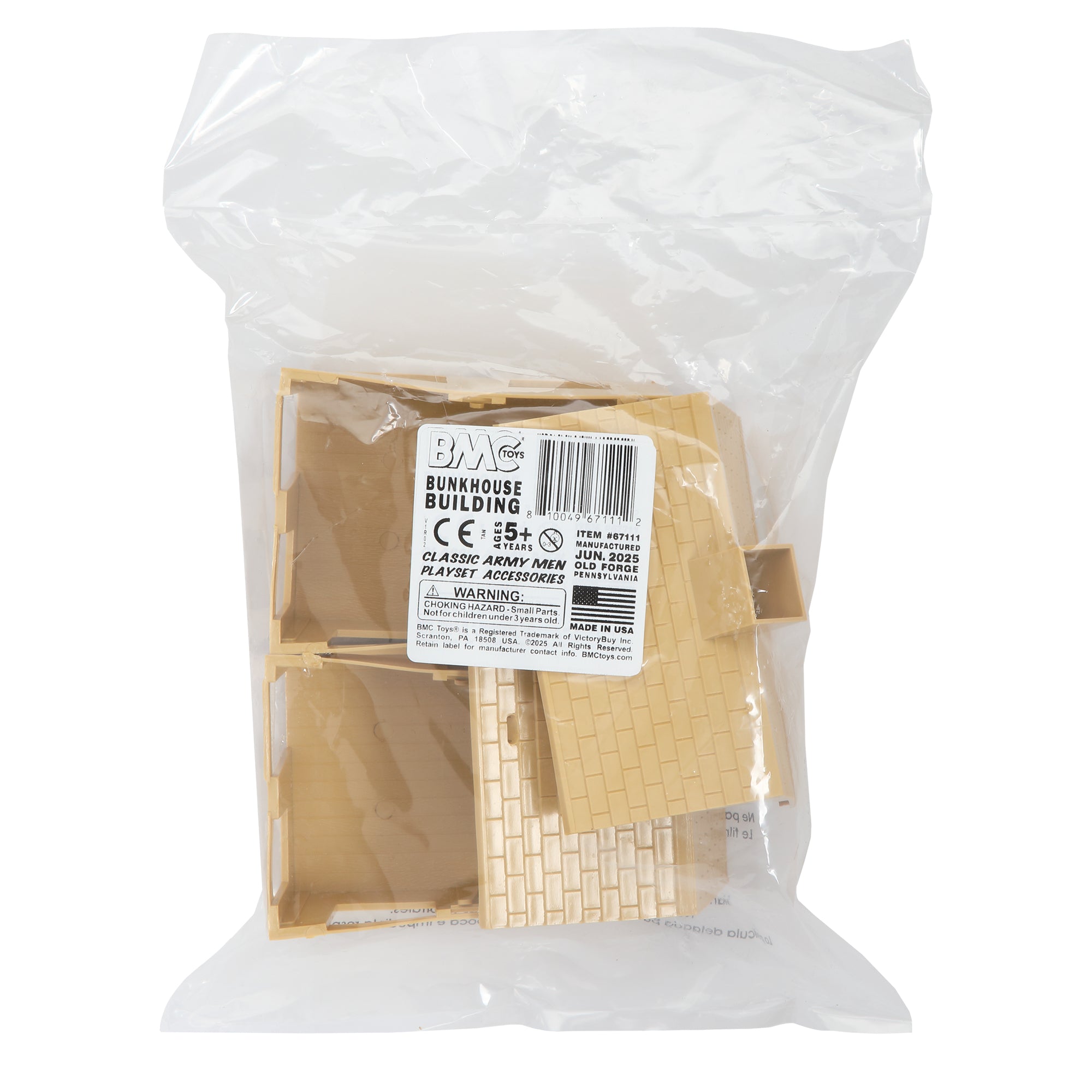 From the BMC Toys Classic Army Men Collector Series, the MPC Bunkhouse includes 2 cabins that connect together to form a long house. Each building measures 5 inches tall x 4.25 inches wide x 5.25 inches long or 10.5 inches long when connected together. Made from Tan color slightly stiff HDPE plastic and approximately 1:32 scale. These houses were first offered around the 1960s by MPC (Multiple Products Corporation). This new production is manufactured using the original plastic injection tools which have been restored and improved by removing the obsolete floor pegs, making chimneys taller, and refining fit of bottom clip. These accessories are a perfect addition for Playsets and school project dioramas of many eras and conflicts from the old west to 20th century. Minor assembly requires clipping on roofs and connecting the 2 cabins to make the Bunkhouse. Packed in clear bag with insert card and recommended for ages 5 and up.