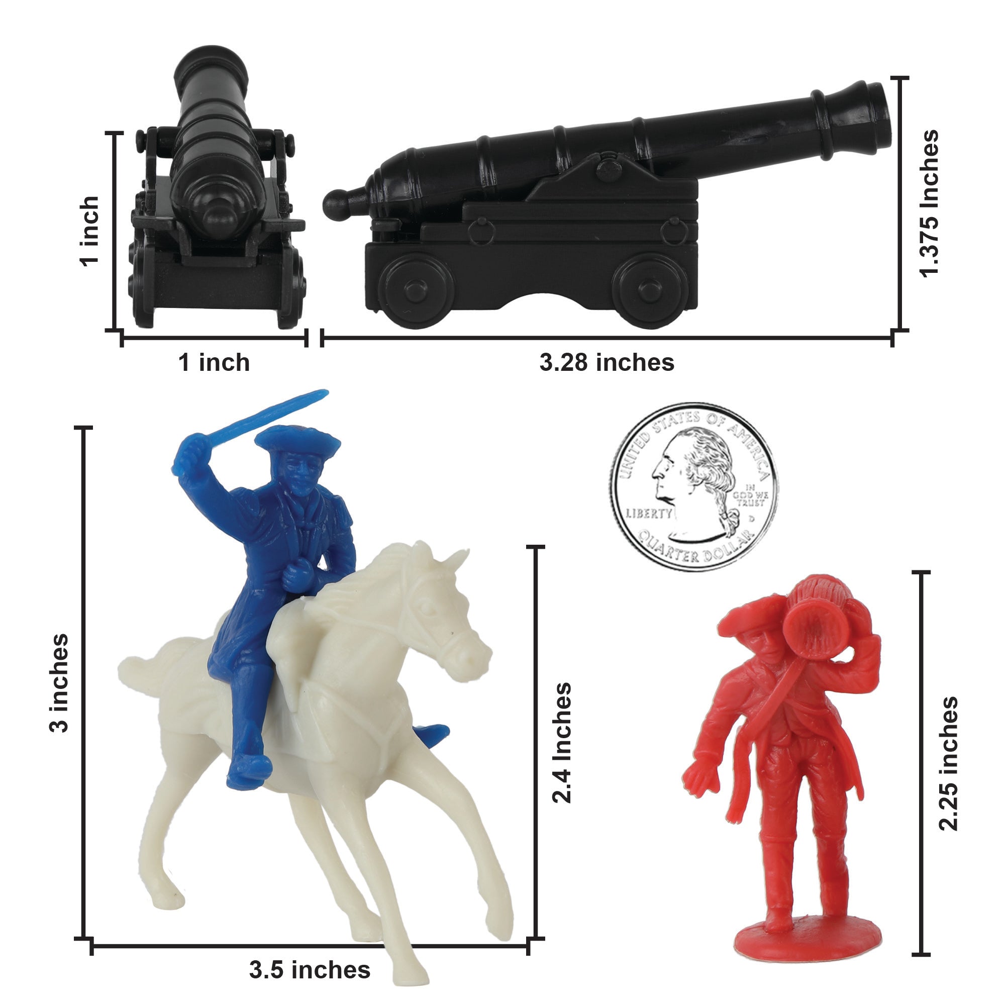 From the BMC Toys American Hero Collector Series, a decisive victory for the Americans: The American Revolutionary War Battle of Yorktown Artillery Attack 32 piece Plastic Army Men Set features 10 different figures and includes 9 Colonial Americans in blue, 9 British Empire Redcoats in red, and 9 French Soldiers in Antique-White. Also includes character figure of General George Washington astride his horse 'Blueskin', and 3 Naval 12 Pounder Cannon. The figures are made from fairly flexible LDPE plastic with medium detail, stand up to 2.3 inches tall and are 1:32nd scale. Cannon measure 1 inch x 1 inch x 3 inches long and are made from stiff black color ABS plastic. BMC Toys was founded by Bill McMaster in 1991 and specializes in producing historically accurate Plastic Army Men figures and Playsets in the classic realsitic style of the 1950s and 1960s. Packaged in clear bag with header card and recommended for ages 5 and up.