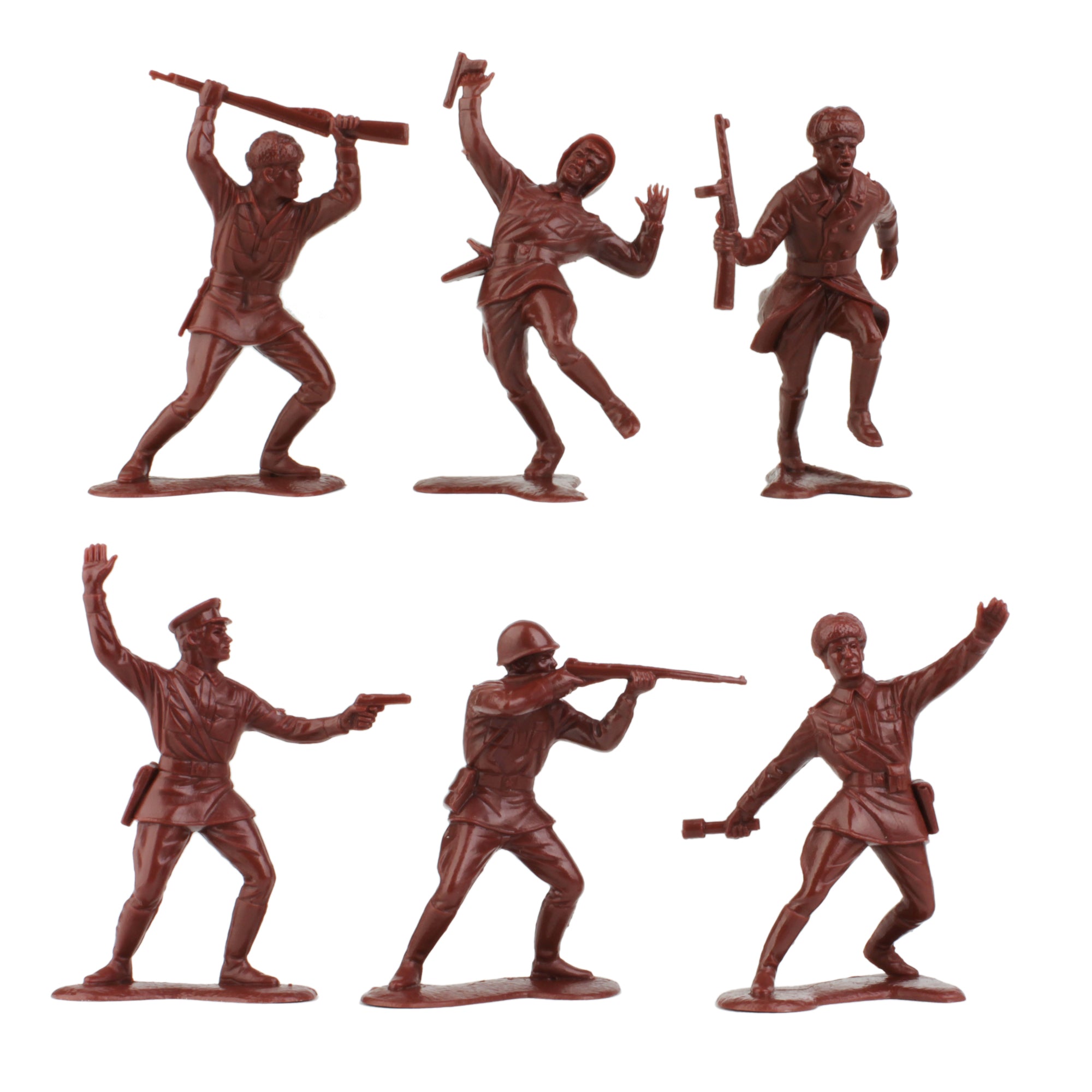 From the Classic Army Men Collector Series, BMC Toys brings back another classic Set of figures from the golden age of Army Men Playsets. This bag of 36 Rust-Brown Russian Plastic Army Men is proudly manufactured in the United States and features 6 different figures. Troops are approximately 1:32 scale and stand up to 2.25 inches tall. Made from slightly flexible LDPE plastic with fine details and almost no flashing. Includes approximately 4 each of the standing riflemen, shot soldier, officer, and about 8 each of figures running with burp SMG, throwing grenade, and butting with rifle.