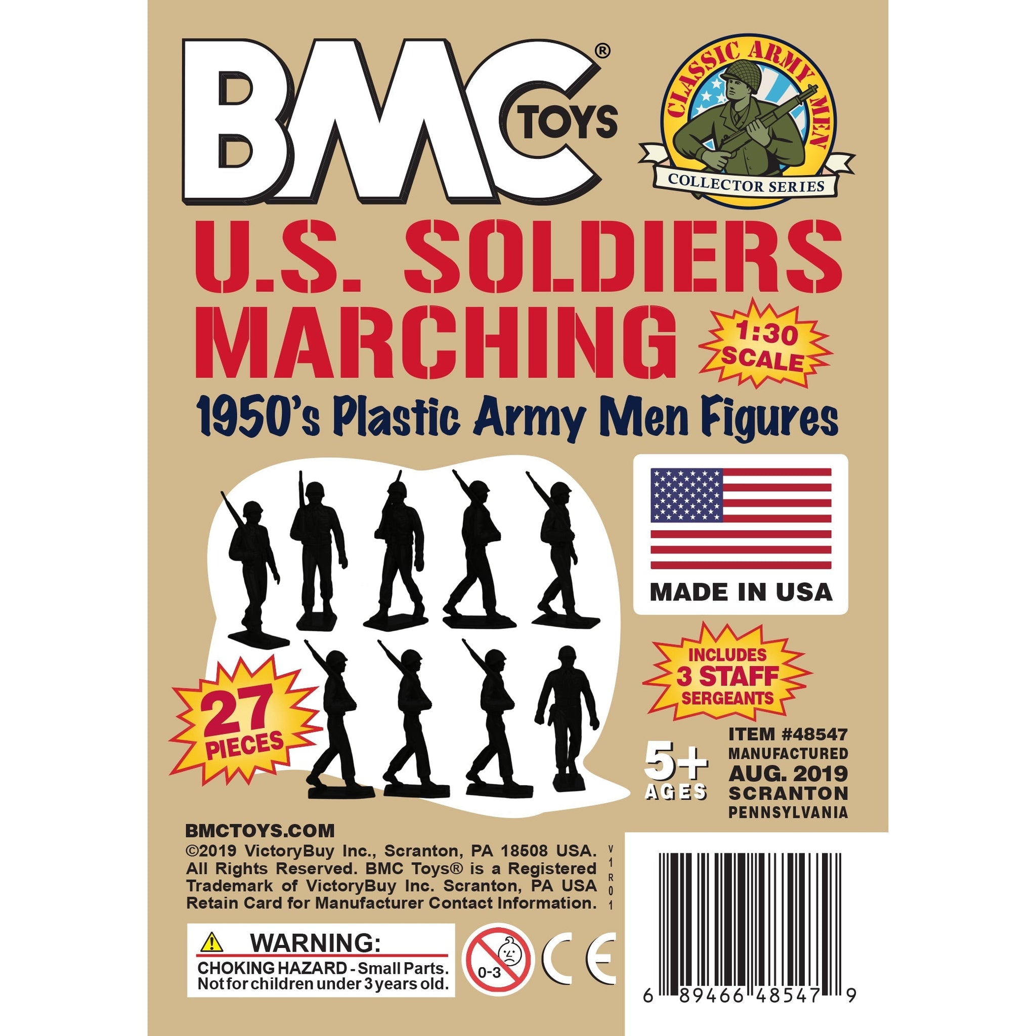 From the Classic Army Men Collector Series, BMC Toys brings back an iconic Set of figures from the Golden Age of Army Men Playsets. This pack of 27 Tan WW2 US Soldier Plastic Army Men is proudly manufactured in the United States and features 24 marching Privates and 3 Staff Sergeants. Troops are approximately 1:30 scale, stand up to 2.5 inches tall, and are made from flexible tan color LDPE plastic with good details and a little flashing. These figures were originally produced around 1954 by Louis Marx & Company, and later produced in hard plastic for the hobby market. These are excellent troops for a variety of set ups from WW2 to Cold War conflicts. This is a Set of real American Made plastic toys, meant to be set up, knocked down, picked up and played with for many years to come. Little Green Army Men have even been inducted into the National Toy Hall of Fame. Packed in clear bag with insert card and recommended for ages 5 and up.