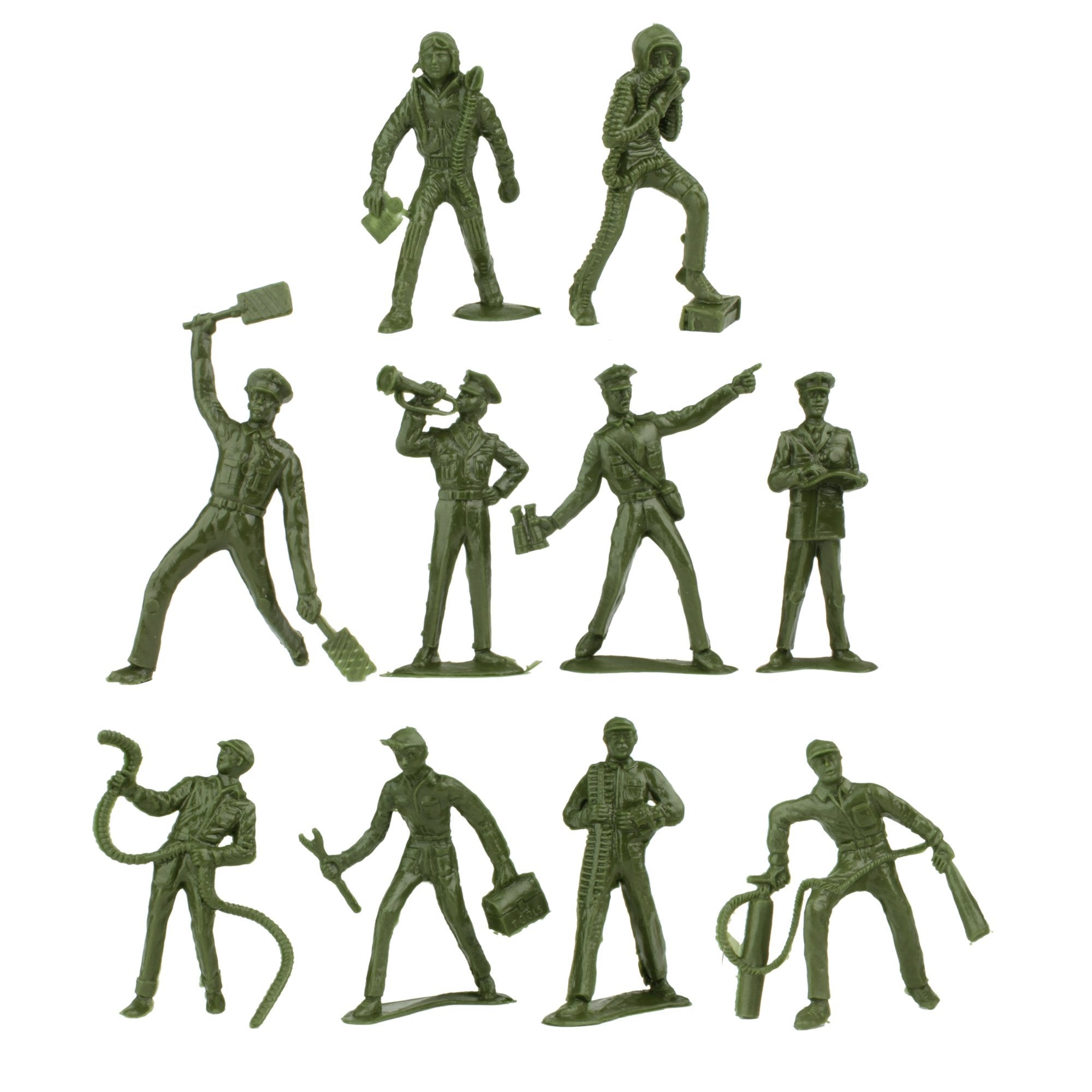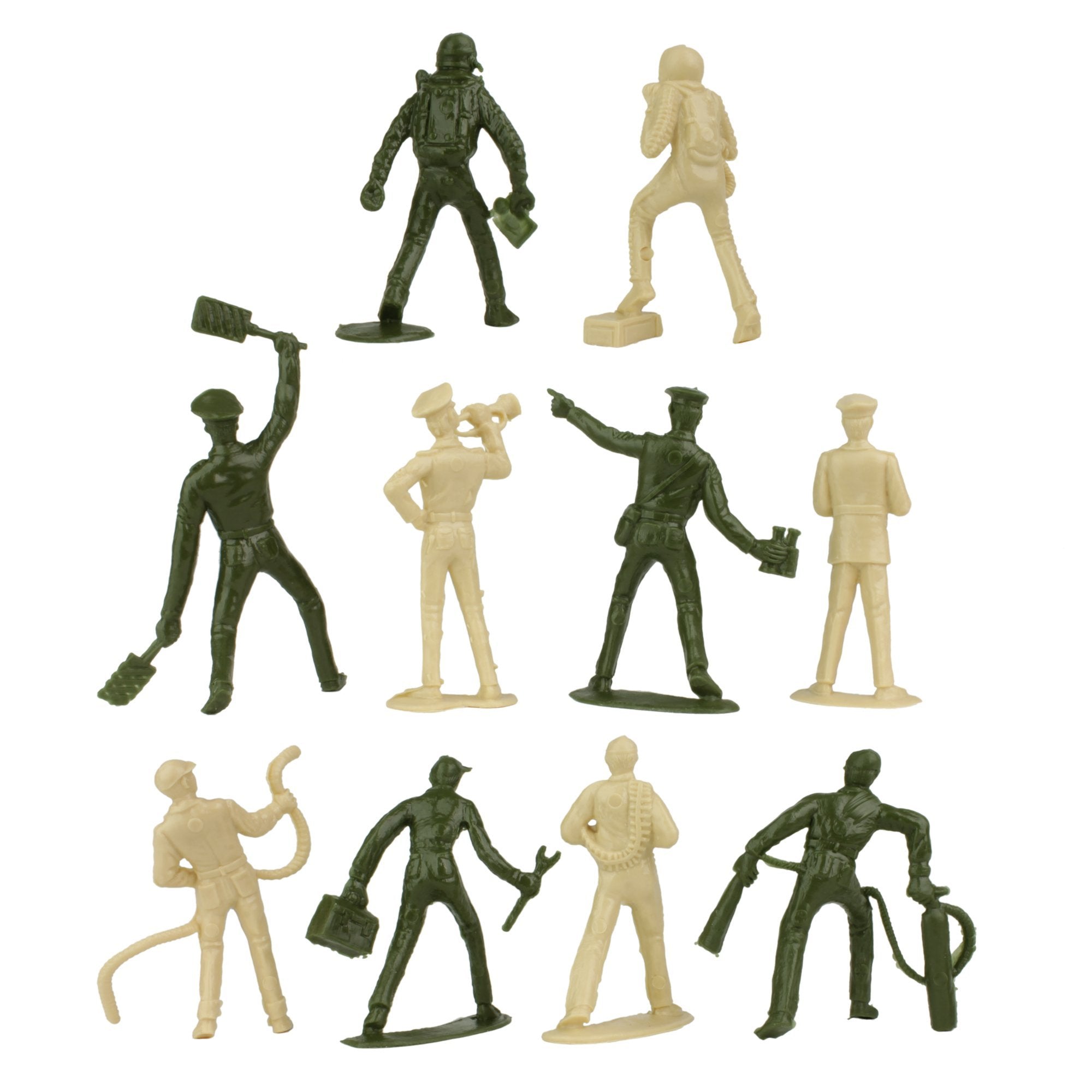 An American Classic is back in action. This bag of 26 Tim Mee Toy Plastic Army Men is proudly manufactured in the United States, and includes 13 tan and 13 Olive-Green US Air Force Troops for maximum play value. There's 10 different figures and all your old favorites are here, including pilot, pilot in pressure suit, mechanic, munitions loader, navigator, fuel specialist, firefighter, signal officer, bugler, and officer with charts. Figures stand up to 2.6 inches and are approximately 1:30 scale. Made from slightly flexible LDPE plastic with medium detail and some flashing due to the age of the plastic injection tool. Originally produced by Processed Plastic Co. (Tim Mee Toy's parent company at the time) around 1964, these figures were slightly smaller copies of earlier Tim Mee Toy Air Force figures from the 1950's. These Cold War Era figures show the evolution of Plastic Army Men from cleverly balanced and Free standing, to the bases that almost all plastic Army figures use today. The Free standing figures stand up surprising well, with the exception of the fuel specialist that usually needs to propped against another figure or accessory to do his job upright. This is the first time these figures have been produced in decades, and the very first time they have been offered in Olive-Green and Desert-Tan. The manufacturer has even restored the classic gauntlet and lightning bolt logo from vintage packaging on the header card. These are real plastic heroes, meant to be set up, knocked down, picked up and played with for years to come. Little Green Army Men have even been inducted into the National Toy Hall of Fame. Packed in clear bag with header card and recommended for ages 5 and up.