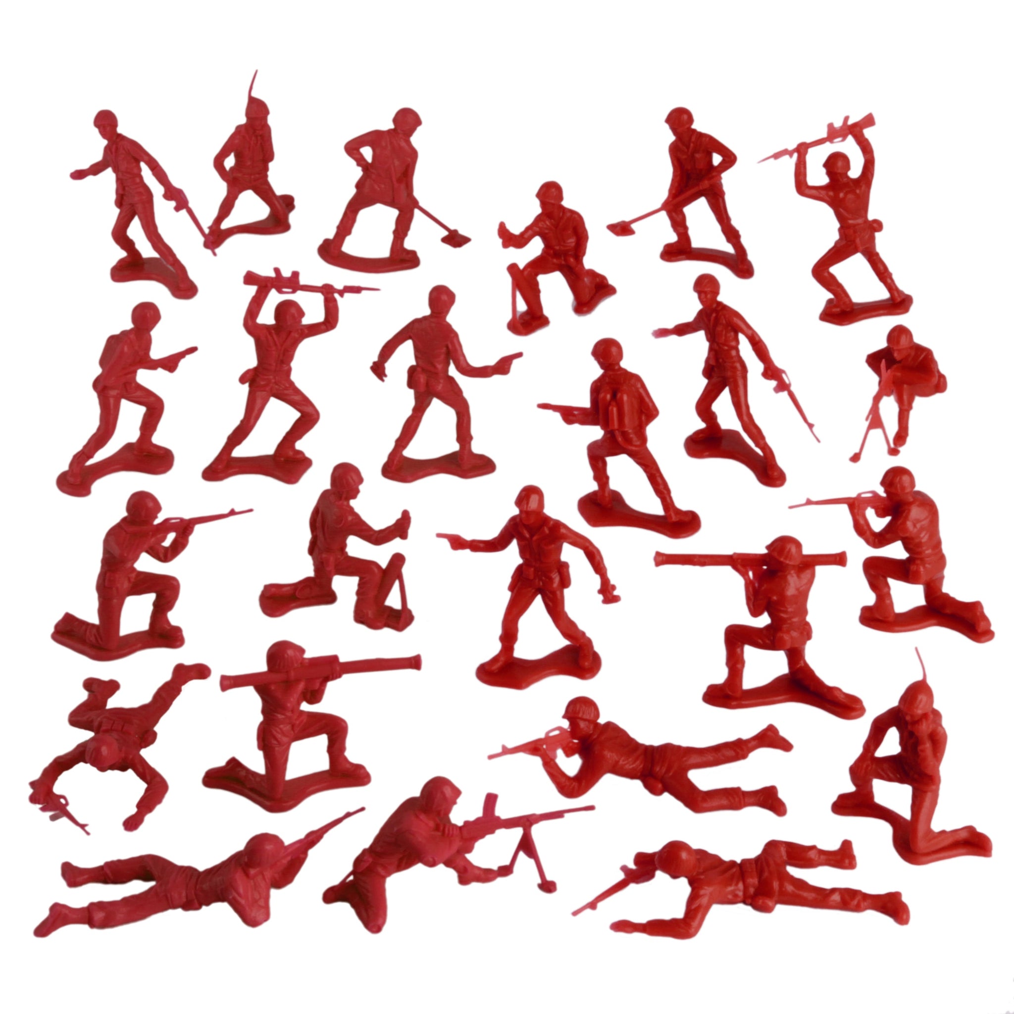 An American Classic for generations. This bag of 48 Tim Mee Toy Plastic Army Men is proudly manufactured in the United States, and includes 48 red troops for maximum play value. There's about 12 different figures and all your old favorites are here, including minesweeper, bazookaman, radio operator, 60mm mortar, LMG operator, kneeling rifleman, flame thrower, crawling rifleman, prone rifleman, bayonet fighter, and officer with binoculars. Figures stand up to 2.1 inches tall and are approximately 1:35 scale. Made from slightly flexible LDPE plastic with medium detail, and very little flashing. Originally produced by Processed Plastic Co. (Tim Mee Toy's parent company at the time) around 1968, these figures were probably the first to depict US Infantry troops of the Cold War era with contemporary equipment. These are real plastic heroes, meant to be set up, knocked down, picked up and played with for years to come. Little Green Army Men have even been inducted into the National Toy Hall of Fame. Packed in clear bag with insert card and recommended for ages 5 and up.