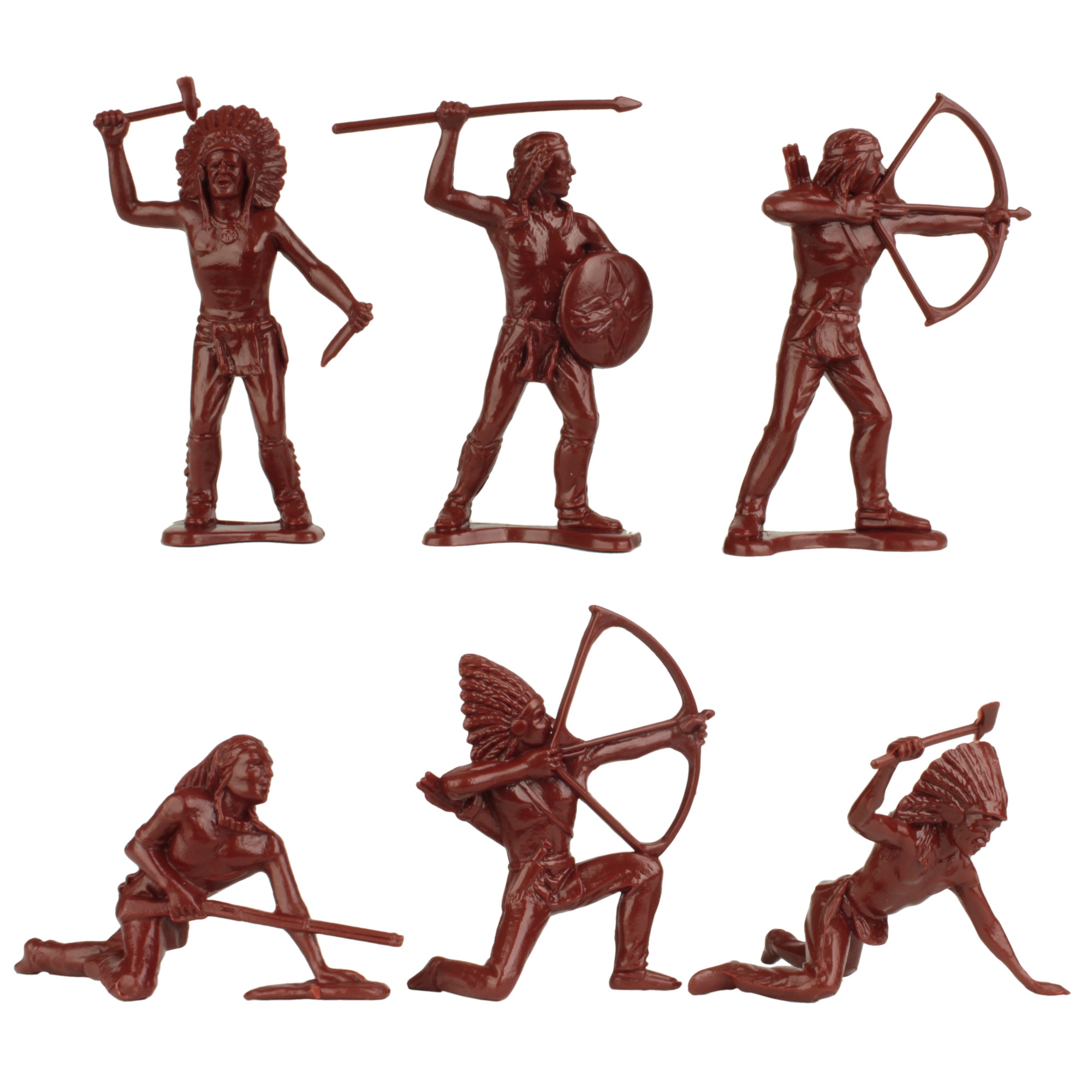 An American Classic is back. This bag of 40 Tim Mee Toy Cowboys and Indians is proudly manufactured in the United States, and includes 20 Tan and 20 Rust-Brown figures for maximum play value. There's 12 different figures including 6 Gunfighters and 6 Braves in classic and dynamic poses. Figures stand up to 2.75 inches tall and are approximately 1:29 scale. Made from slightly flexible LDPE plastic with nice detail and almost no flashing.