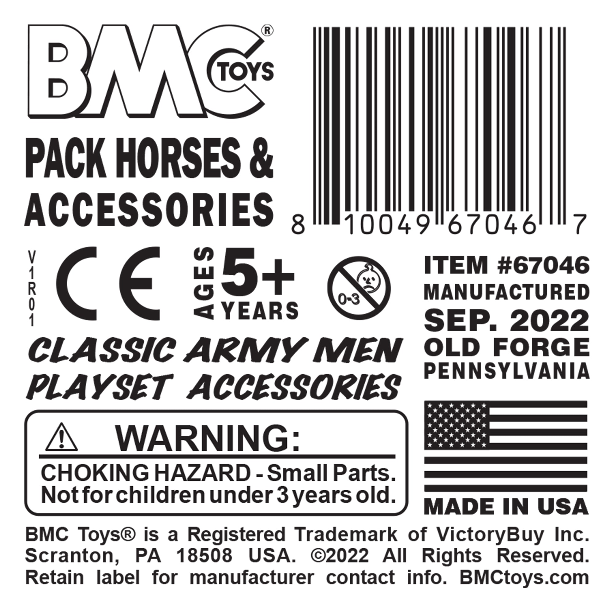 From the Classic Army Men Collector Series, BMC Toys brings back more classic accessories from yesteryear. This 5 piece Set includes 2 horses with some old-timey accessories. Each horse is identical and includes removable bridle leads and packs. The other accessories are a water pump, water trough, and butter churn. Pieces are made from slightly stiff brown color HDPE plastic and are approximately 1:32 scale. These horses were first offered around 1962 by Louis Marx and Co. and were included in a number of their legendary Playsets spanning many years including some Fort Apache boxed Sets. This new production is manufactured using the original plastic injection tools. Perfect to add to Playsets, dioramas and suitable for 18th century and Old West through early and mid-20th century time periods and beyond. This is a Set of real American Made toys, meant to be set up, knocked over, picked up, and played with for many years to come. Packed in clear bag bag with label and recommended for ages 5 and up.