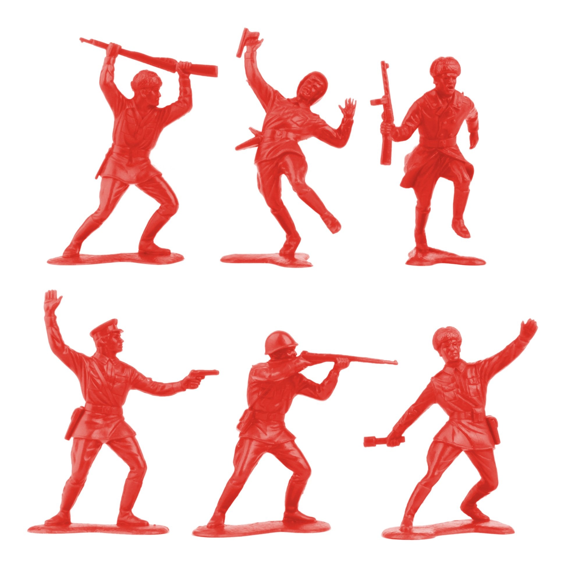 From the Classic Army Men Collector Series, BMC Toys brings back another classic Set of figures from the golden age of Army Men Playsets. This bag of 36 Bright Red Russian Plastic Army Men is proudly manufactured in the United States and features 6 different figures. Troops are approximately 1:32 scale and stand up to 2.25 inches tall. Made from slightly flexible LDPE plastic with fine details and almost no flashing. Includes approximately 4 each of the standing riflemen, shot soldier, officer, and about 8 each of figures running with burp SMG, throwing grenade, and butting with rifle. These USSR Soldiers were originally introduced in the 1960s by Louis Marx Company as Allies in some of their famous WW2 Battleground Playsets. They were later produced by other companies (possibly HG TOYS) and did duty as stand-ins for Korean and even Iraqi forces in some later Playsets. They were later produced in hard plastic for the hobby market. These will make excellent troops for a variety of set ups from Western Front in WW2 to Cold War conflicts with Russia, the Soviet Union communists, or generic bad-guys for your regular Green Army men. This is a Set of real American Made plastic toys, meant to be set up, knocked down, picked up and played with for many years to come. Little Green Army Men have even been inducted into the National Toy Hall of Fame. Packed in clear bag with insert card and recommended for ages 5 and up.