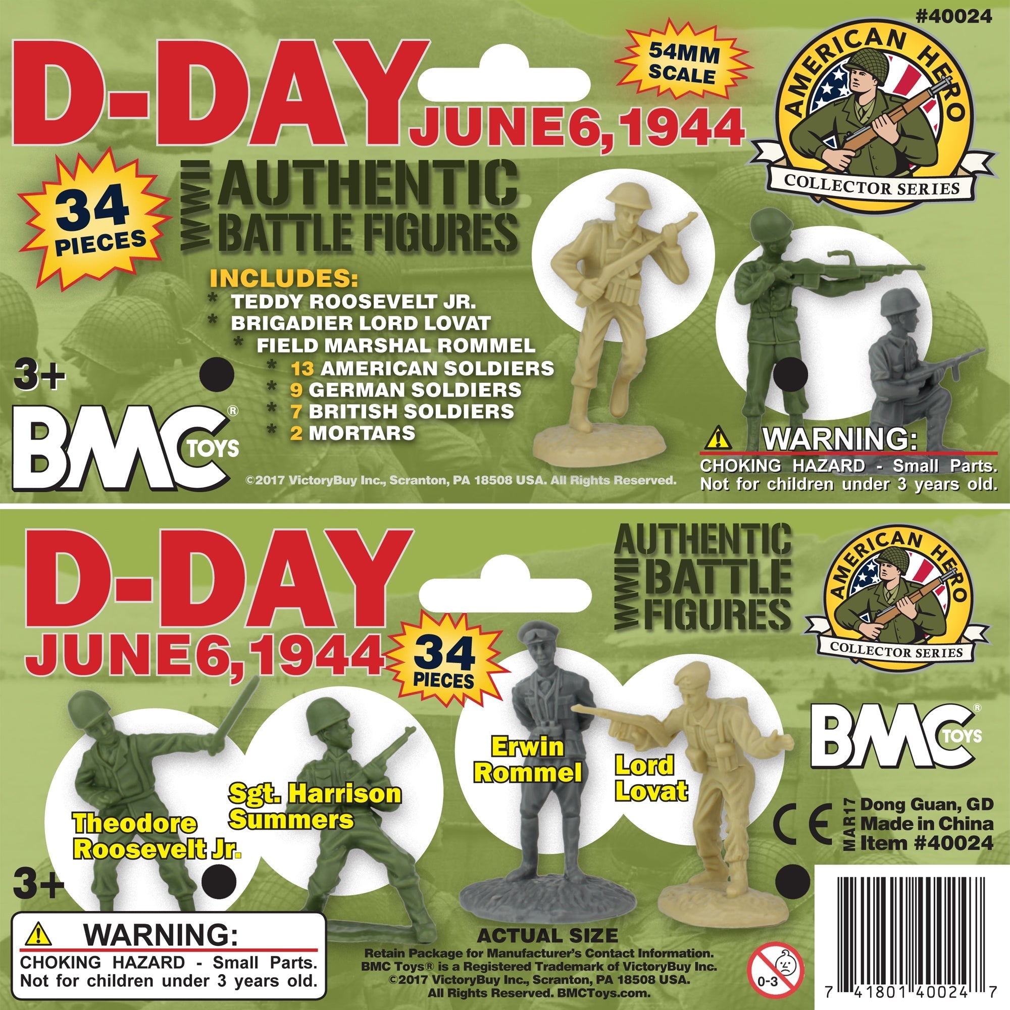 From the BMC Toys American Hero Collector Series, the greatest invasion in military history: The D-Day June 6, 1944 34 piece Plastic Army Men Set features 14 American GIs in OD-Green, 8 British Tommies in tan, 10 German Soldiers in gray, and 2 black mortars. This Set features character figures of Brigadier General Teddy Roosevelt Jr., Brigadier Lord Lovat, Sergeant Harrison Summers, and Field Marshal Erwin Rommel. Made from flexible LDPE plastic with medium detail and very little flashing, figures stand up to 2.45 inches tall and are about 1:32nd scale. BMC Toys was founded by Bill McMaster in 1991 and specializes in producing historically accurate Plastic Army Men figures and Playsets in the classic realistic style of the 1950s and 1960s. Packaged in clear bag with header card and recommended for ages 5 and up. The 2017 release features all new header card art.