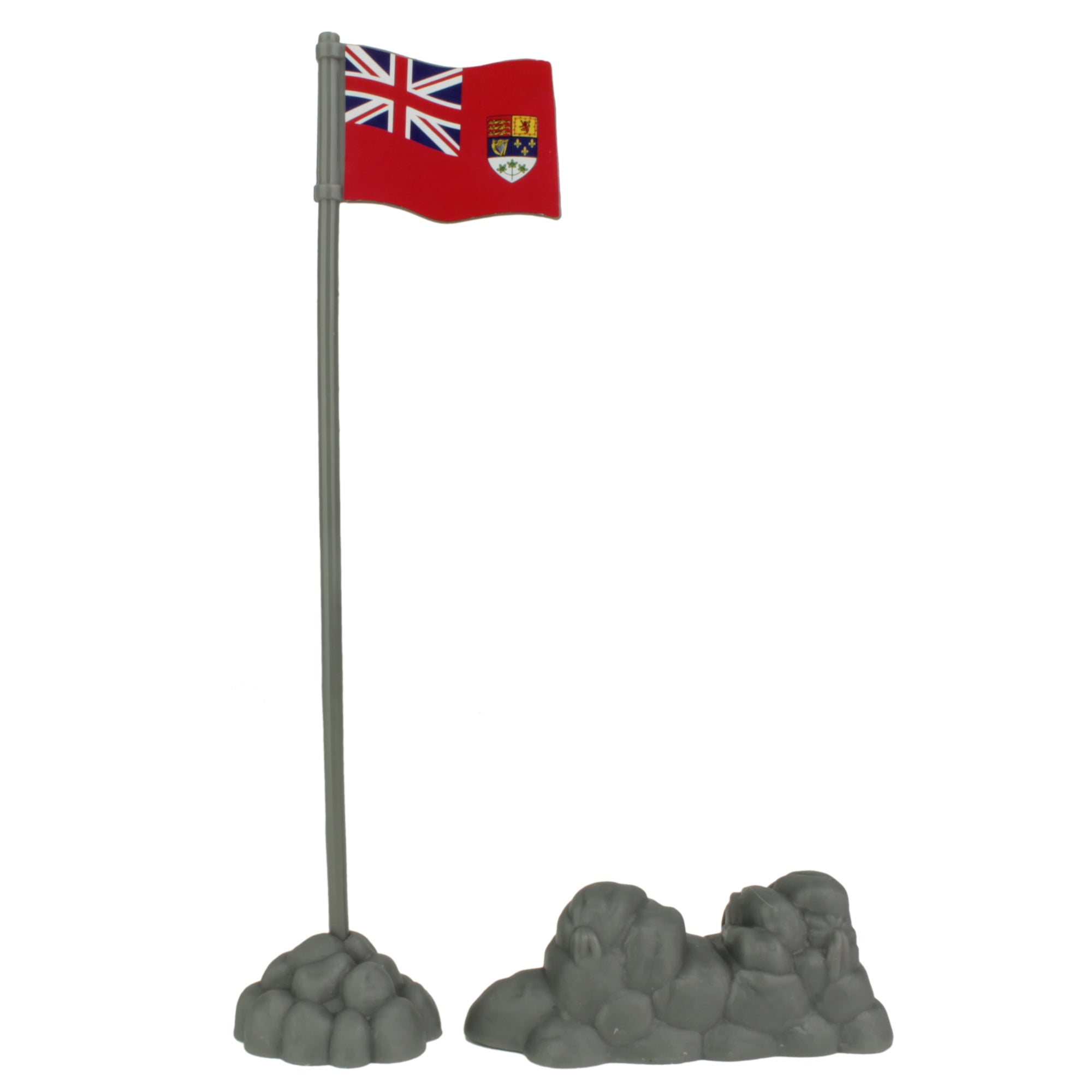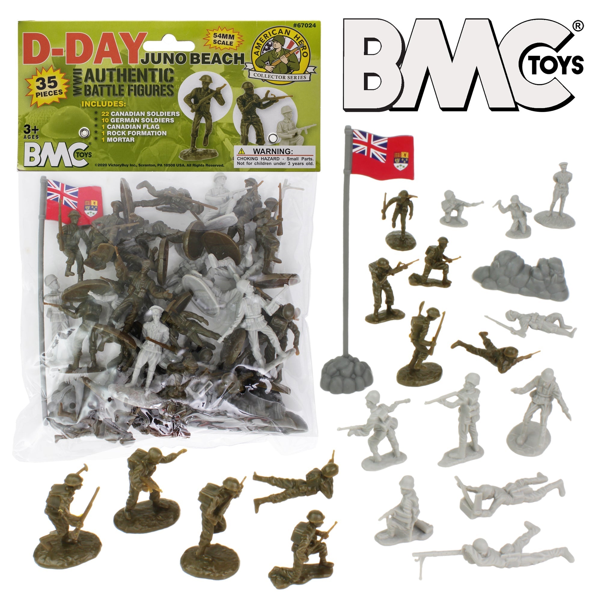 From the BMC Toys American Hero Collector Series, the greatest invasion in military history: The D-Day June 6, 1944 Juno Beach 35 piece Plastic Army Men expansion pack features 22 Canadian troops in khaki green, 10 German Soldiers in Light-Gray, Canada's flag, and a rock formation.