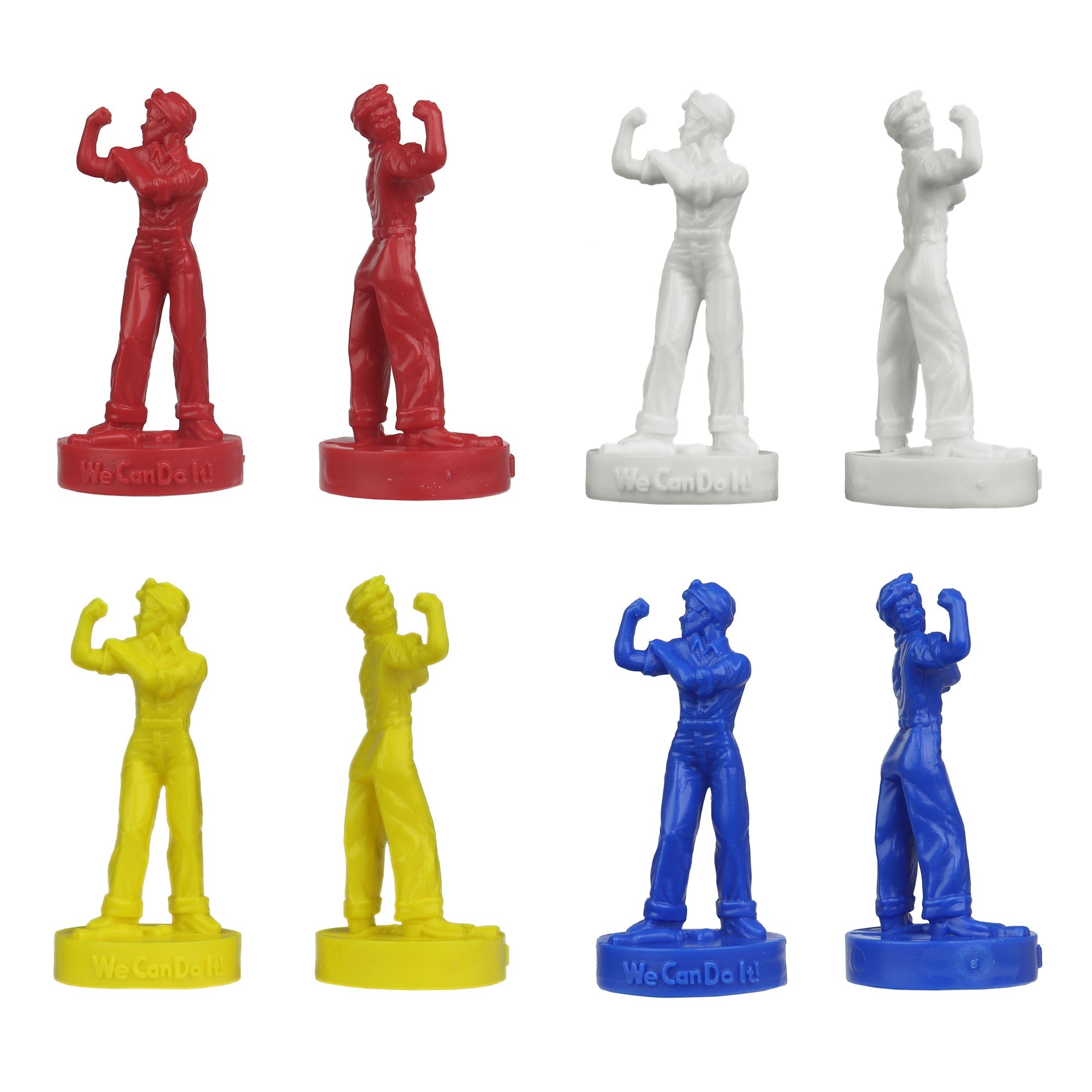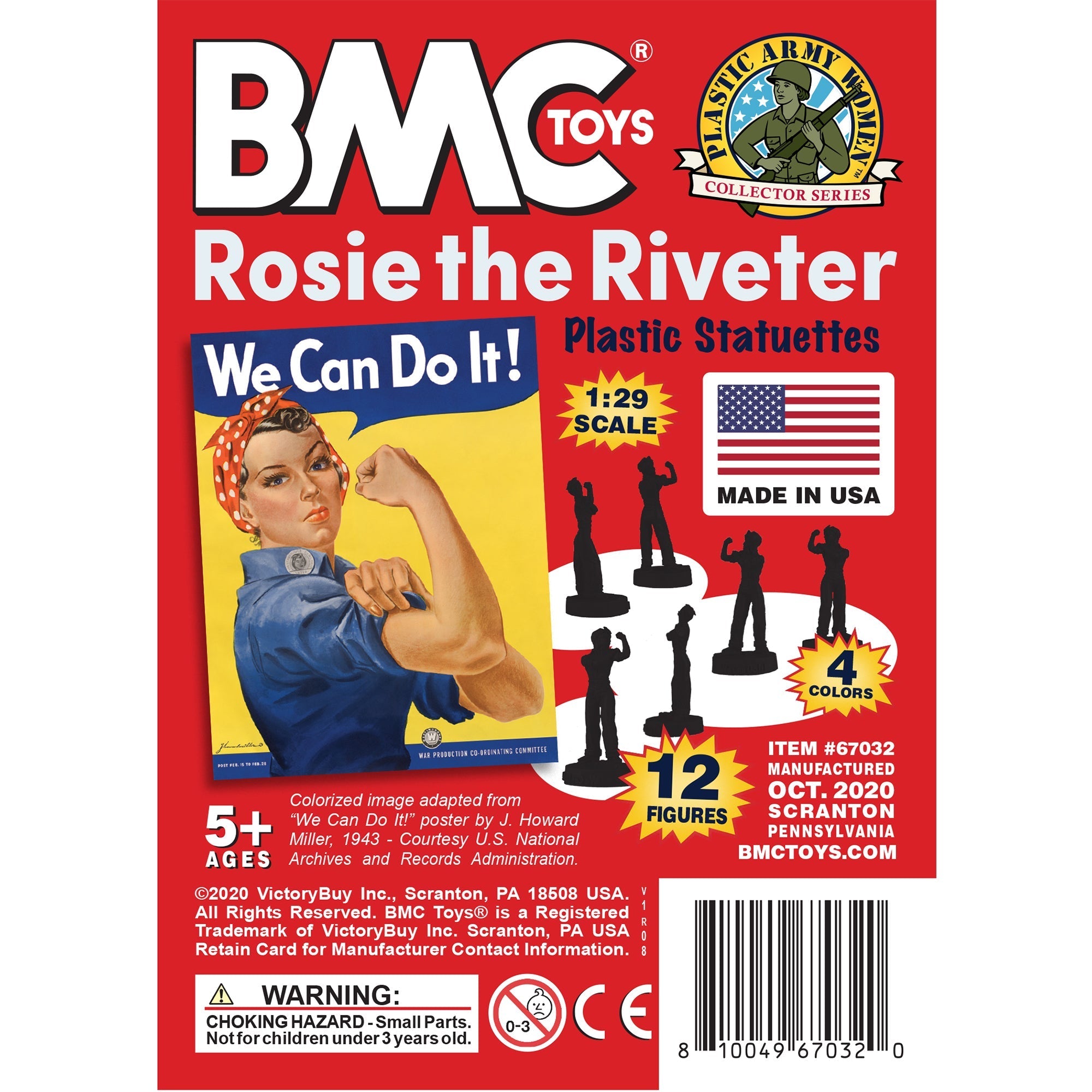 The BMC Toys Rosie the Riveter is an all new original toy figure. The 12 piece Set includes 3 each red, white, blue and yellow figures. She stands 2.5 inches tall including the round pedestal base that features her popular 'We Can Do It.' slogan. Made from slightly stiff HDPE Plastic and is approximately 1:29 scale.