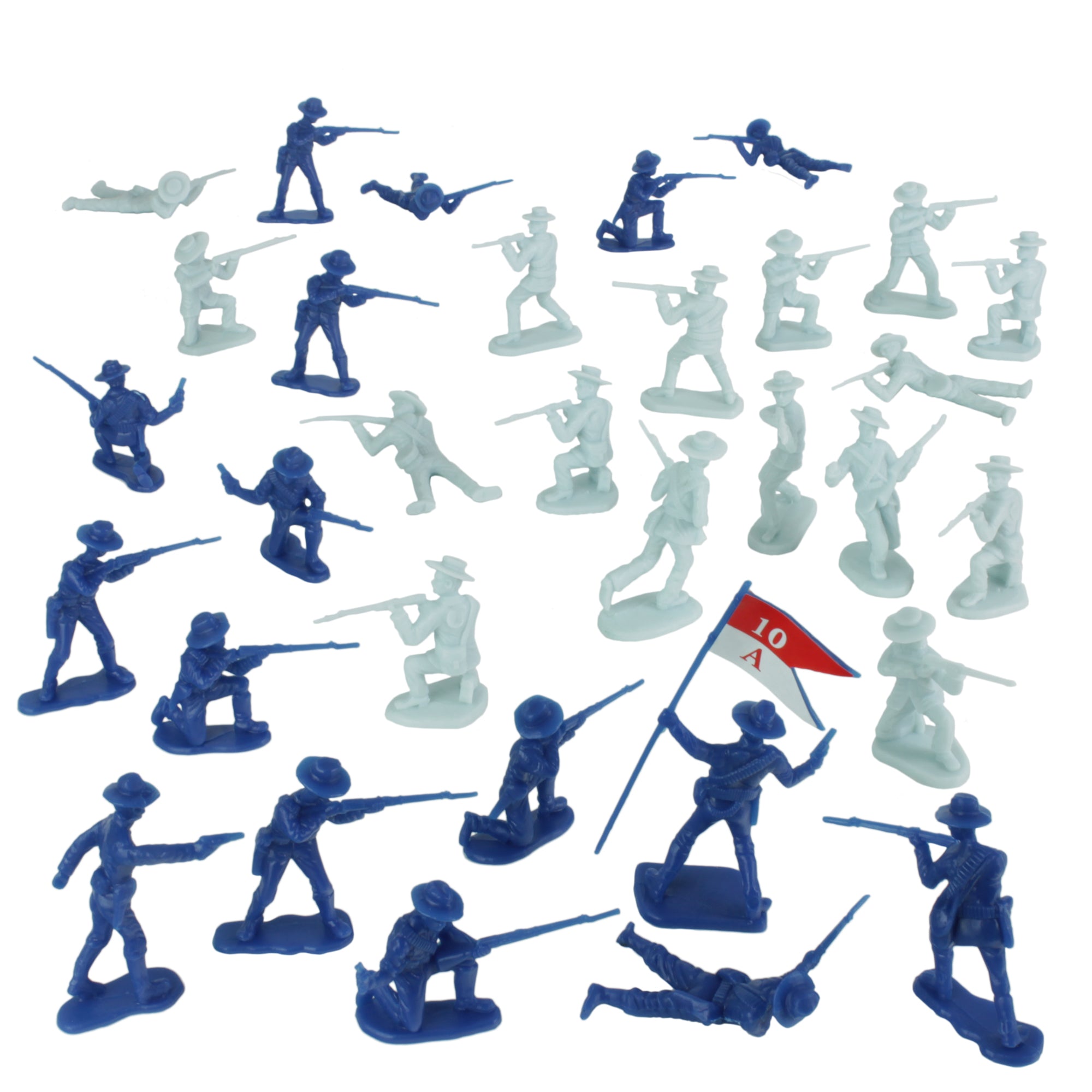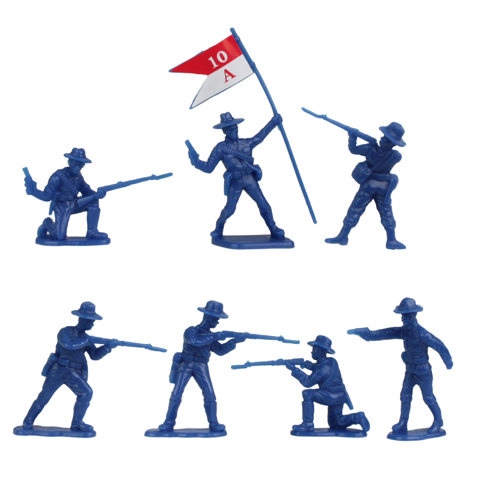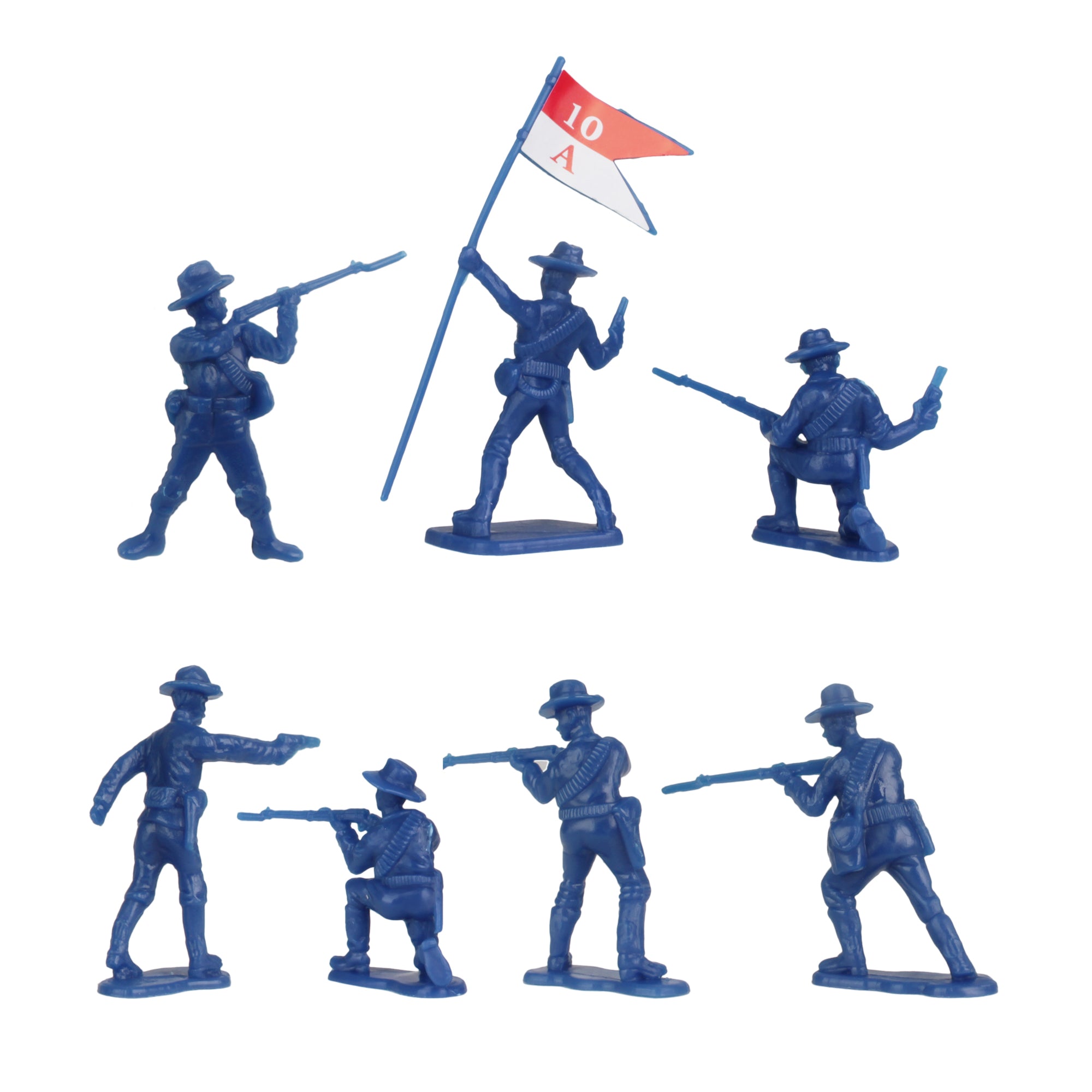From the BMC Toys American Hero Collector Series: The Buffalo Soldiers' Charge up San Juan Hill 32 piece Plastic Army Men Set features 13 different figures and includes Sergeant George Berry, 1st Lieutenant John J. Pershing, 14 10th Cavalry Buffalo Soldiers in Medium Blue, and 16 Spanish Soldiers in Light Bluish Gray to represent Rayadillo uniforms. Made from fairly stiff, very durable, polypropylene plastic with medium detail and very little flashing, figures stand up to 2.25 inches tall and are about 1:32nd scale. These figures were first offered in 1999 as part of the BMC Toys The Rough Riders Charge up San Juan Hill boxed Playset and have not been produced in more than a decade. The 2019 release features new header card art and colors. BMC Toys was founded by Bill McMaster in 1991 and specializes in producing historically accurate Plastic Army Men figures and Playsets in the classic realistic style of the 1950s and 1960s. Packaged in clear bag with header card and recommended for ages 5 and up.