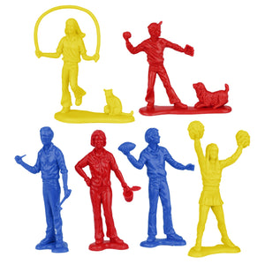 From a time not so long ago and from a place that may or may not have existed, comes the quintessential nuclear family, forever frozen in plastic perfection. The Tim Mee Toy People at Play figure Set is proudly manufactured in the United States, and includes 6 each Yellow, Red, and Blue color figures for maximum play value. Six different figures are included and the whole family is here - classic Dad with his pipe and hammer, gardening Mom with her trowel and flower pot, Jr. casually tossing a football, Sis at cheerleader practice, Little Brother playing baseball with the family dog, and Little Sister jumping rope as her cat calmly supervises. Figures stand up to 2.5 inches tall and are about 1:35 to 1:32 scale. Made from slightly flexible LDPE plastic with crisp detail and almost no flashing. Originally produced by Processed Plastic Co. (Tim Mee Toy's parent company at the time) in the 1970s, they are often referred to by Collector as Suburban Family Figures, People Play Figures, or just People Figures. This idyllic family represents a bygone era of folks enjoying leisurely activities on a sunny afternoon, but they are incredibly versatile pieces for use in train layouts, dioramas or dollhouses. They'll fit into almost any Playset alongside Little Green Army men, space aliens, as B-Movie victims, zombie apocalypse survivors, or even Dinosaur tourists. Packed in clear bag with insert card that features vintage mid-century advertising art. These are real American made plastic toys, meant to be set up, knocked down, picked up and played with for years to come. Recommended for ages 5 and up.